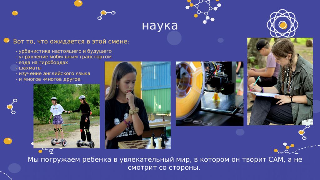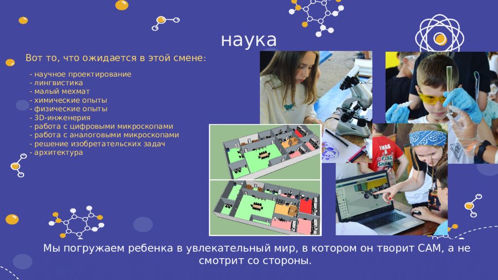 Вот то, что ожидается в этой смене : - научное проектирование - лингвистика - малый мехмат - химические опыты - физические опыты - 3D-инженерия - работа с цифровыми микроскопами - работа с аналоговыми микроскопами - решение изобретательских задач - архитектура Мы погружаем ребенка в увлекательный мир, в котором он творит САМ, а не смотрит со стороны.