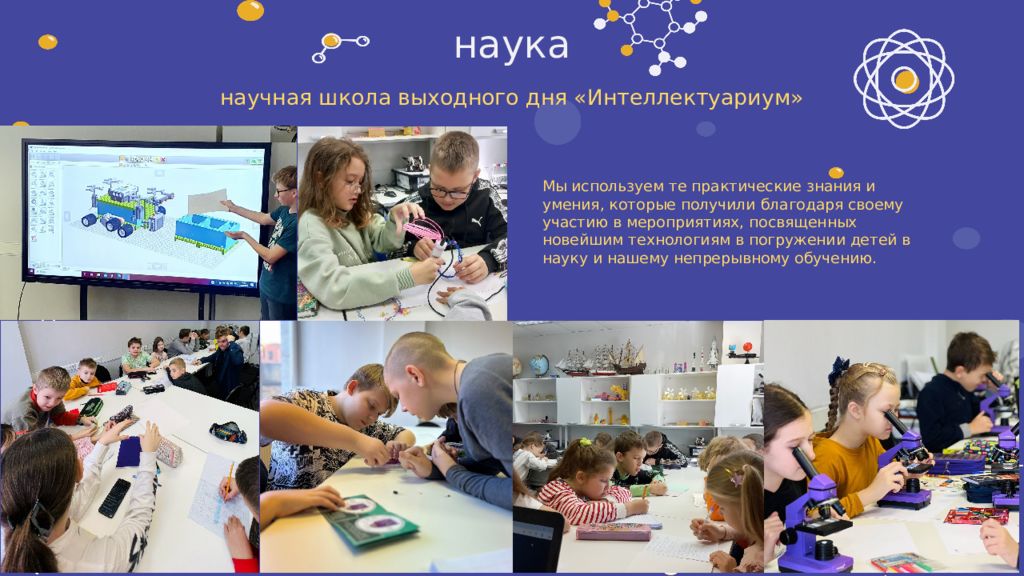 научная школа выходного дня « Интеллектуариум » Мы используем те практические знания и умения, которые получили благодаря своему участию в мероприятиях, посвященных новейшим технологиям в погружении детей в науку и нашему непрерывному обучению.