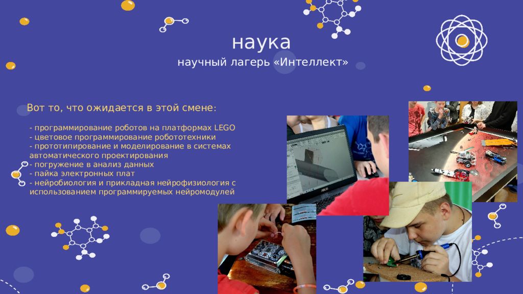 Вот то, что ожидается в этой смене : - программирование роботов на платформах LEGO - цветовое программирование робототехники - прототипирование и моделирование в системах автоматического проектирования - погружение в анализ данных - пайка электронных плат - нейробиология и прикладная нейрофизиология с использованием программируемых нейромодулей научный лагерь «Интеллект»