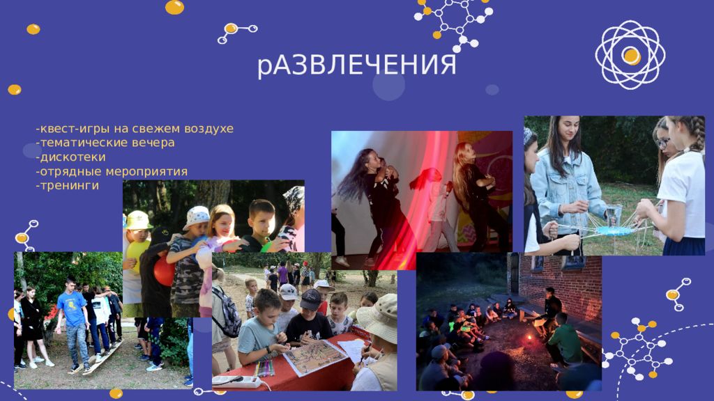 -квест-игры на свежем воздухе -тематические вечера -дискотеки -отрядные мероприятия -тренинги