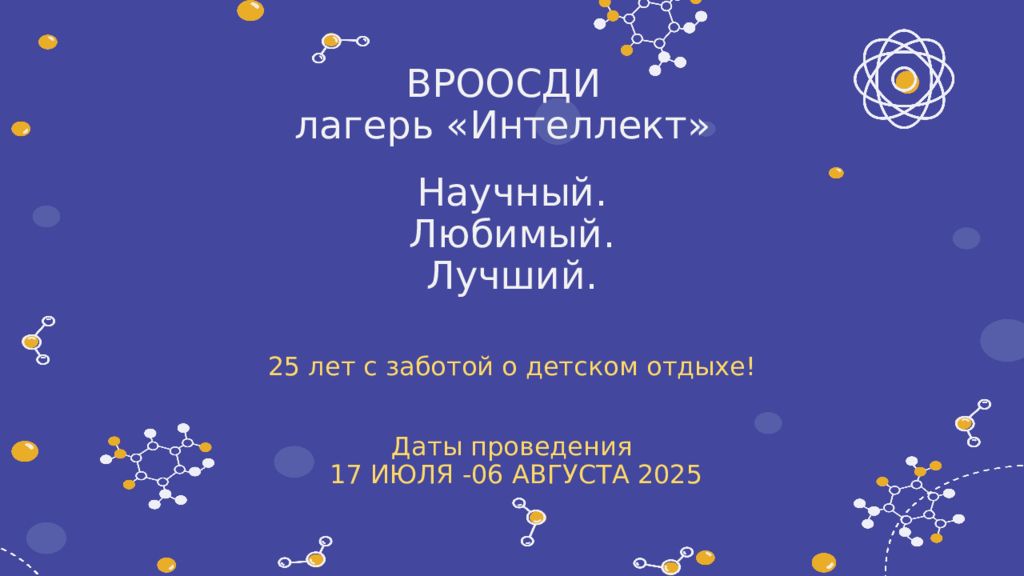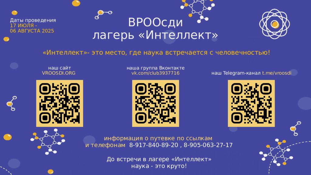 Даты проведения 17 ИЮЛЯ - 06 АВГУСТА 20 2 5 «Интеллект»- это место, где наука встречается с человечностью! наш сайт VROOSDI.ORG наша группа Вконтакте vk.com/club3937716 наш Telegram- канал t.me/ vroosdi информация о путевке по ссылкам и телефонам 8-917-840-89-20, 8-905-063-27-17 До встречи в лагере «Интеллект» наука - это круто!
