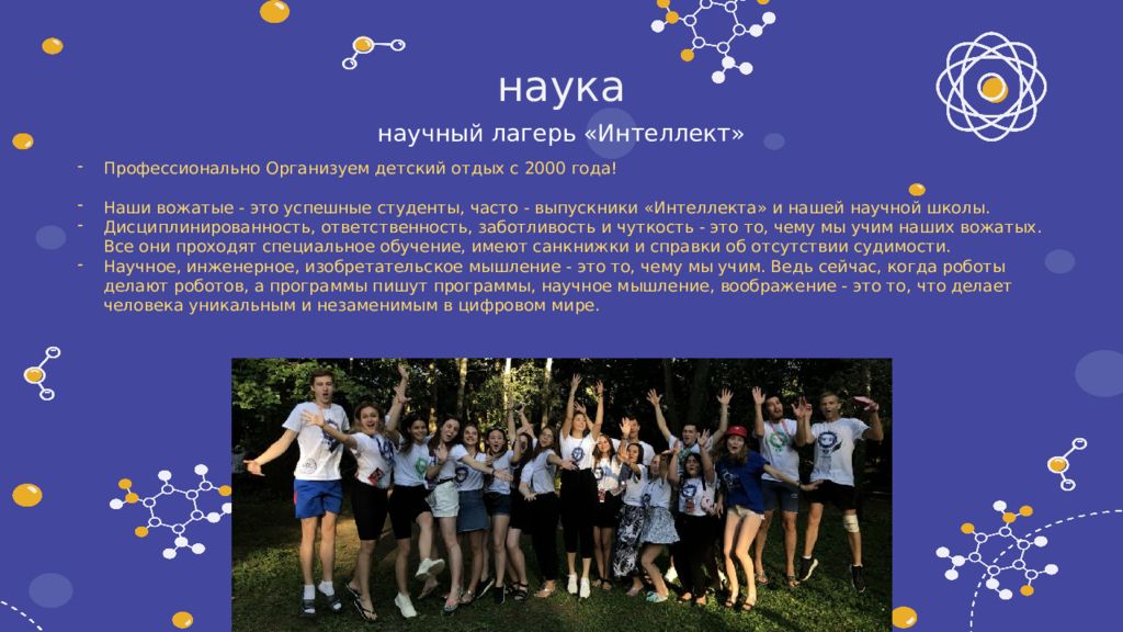 научный лагерь «Интеллект» Профессионально Организуем детский отдых с 2000 года! Наши вожатые - это успешные студенты, часто - выпускники «Интеллекта» и нашей научной школы. Дисциплинированность, ответственность, заботливость и чуткость - это то, чему мы учим наших вожатых. Все они проходят специальное обучение, имеют санкнижки и справки об отсутствии судимости. Научное, инженерное, изобретательское мышление - это то, чему мы учим. Ведь сейчас, когда роботы делают роботов, а программы пишут программы, научное мышление, воображение - это то, что делает человека уникальным и незаменимым в цифровом мире.