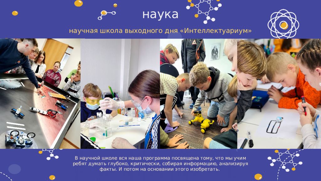 научная школа выходного дня « Интеллектуариум » В научной школе вся наша программа посвящена тому, что мы учим ребят думать глубоко, критически, собирая информацию, анализируя факты. И потом на основании этого изобретать.