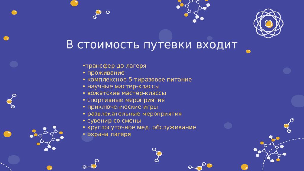 •трансфер до лагеря • проживание • комплексное 5-тиразовое питание • научные мастер-классы • вожатские мастер-классы • спортивные мероприятия • приключенческие игры • развлекательные мероприятия • сувенир со смены • круглосуточное мед. обслуживание • охрана лагеря