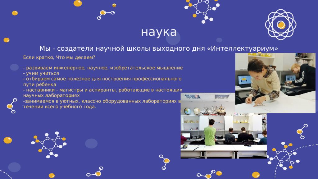 Мы - создатели научной школы выходного дня « Интеллектуариум » Если кратко, Что мы делаем? - развиваем инженерное, научное, изобретательское мышление - учим учиться - отбираем самое полезное для построения профессионального пути ребенка - наставники - магистры и аспиранты, работающие в настоящих научных лабораториях - занимаемся в уютных, классно оборудованных лабораториях в течении всего учебного года.