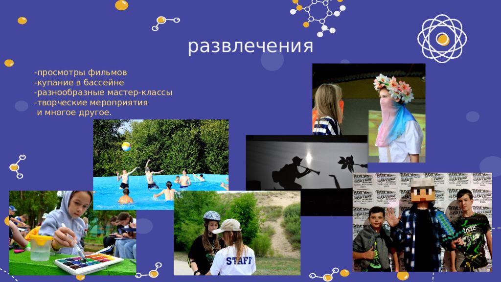 -просмотры фильмов -купание в бассейне -разнообразные мастер-классы -творческие мероприятия и многое другое.