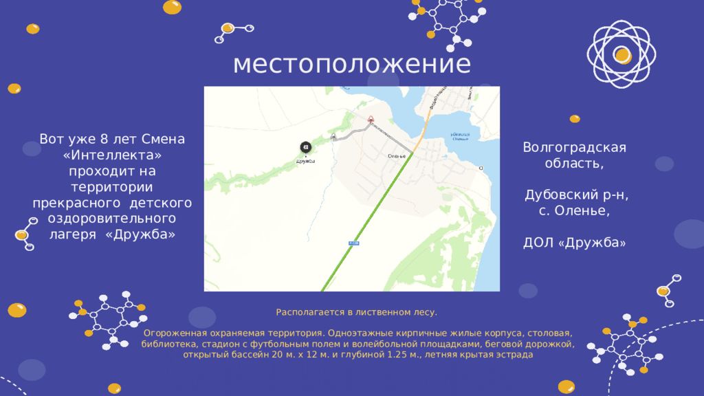 Волгоградская область, Дубовский р-н, с. Оленье, ДОЛ « Дружба » Вот уже 8 лет Смена «Интеллекта» проходит на территории прекрасного детского оздоровительного лагеря «Дружба» Располагается в лиственном лесу. Огороженная охраняемая территория. Одноэтажные кирпичные жилые корпуса, столовая, библиотека, стадион с футбольным полем и волейбольной площадками, беговой дорожкой, открытый бассейн 20 м. х 12 м. и глубиной 1.25 м., летняя крытая эстрада