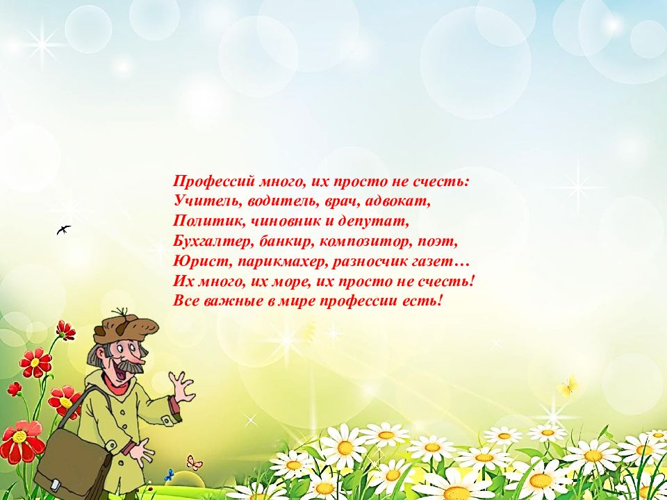 Профессий много, их просто не счесть: Учитель, водитель, врач, адвокат, Политик, чиновник и депутат, Бухгалтер, банкир, композитор, поэт, Юрист, парикмахер, разносчик газет… Их много, их море, их просто не счесть! Все важные в мире профессии есть!
