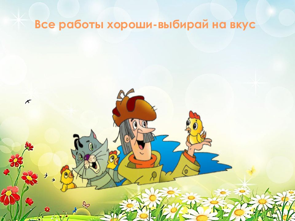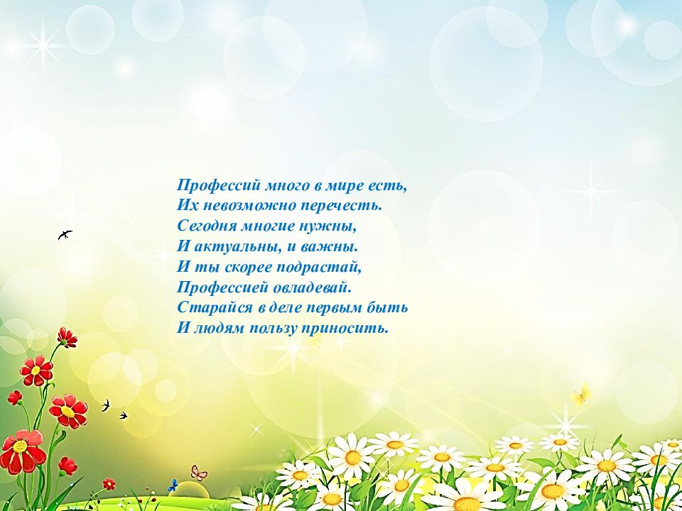 Профессий много в мире есть, Их невозможно перечесть. Сегодня многие нужны, И актуальны, и важны. И ты скорее подрастай, Профессией овладевай. Старайся в деле первым быть И людям пользу приносить.