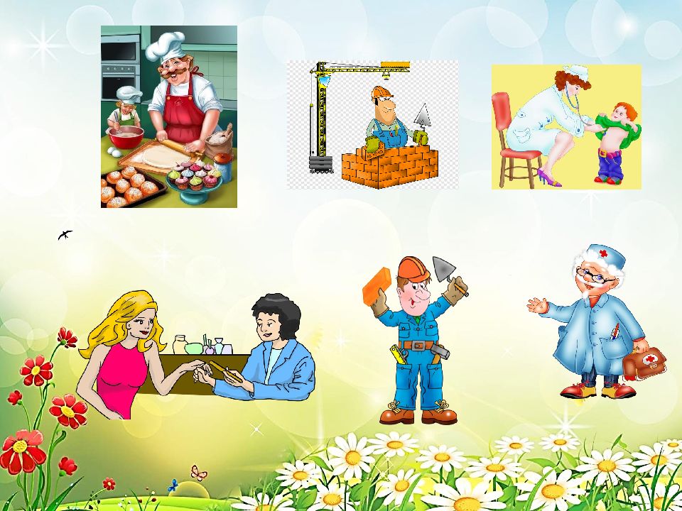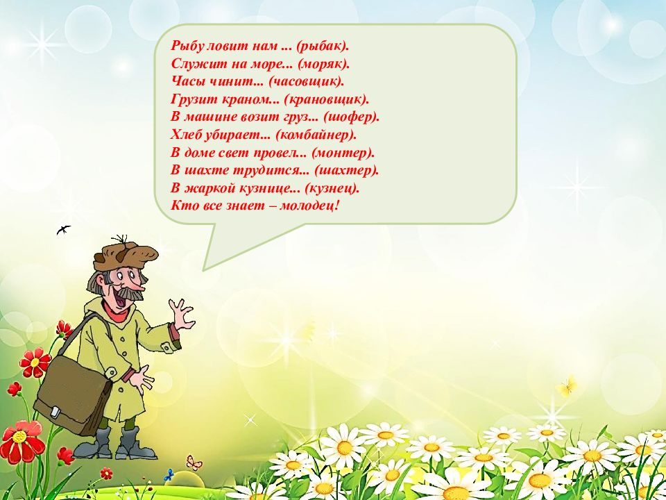 Рыбу ловит нам... (рыбак). Служит на море... (моряк). Часы чинит... (часовщик). Грузит краном... (крановщик). В машине возит груз... (шофер). Хлеб убирает... (комбайнер). В доме свет провел... (монтер). В шахте трудится... (шахтер). В жаркой кузнице... (кузнец). Кто все знает – молодец!