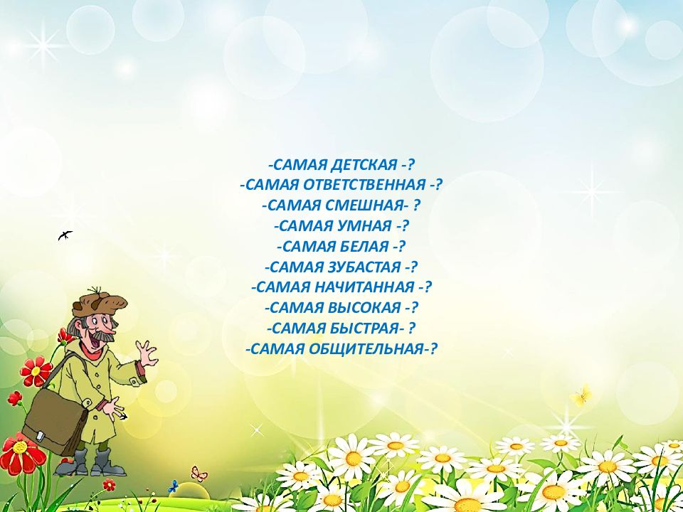 -САМАЯ ДЕТСКАЯ -? -САМАЯ ОТВЕТСТВЕННАЯ -? -САМАЯ СМЕШНАЯ- ? -САМАЯ УМНАЯ -? -САМАЯ БЕЛАЯ -? -САМАЯ ЗУБАСТАЯ -? -САМАЯ НАЧИТАННАЯ -? -САМАЯ ВЫСОКАЯ -? -САМАЯ БЫСТРАЯ- ? -САМАЯ ОБЩИТЕЛЬНАЯ-?