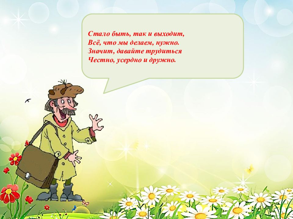 Стало быть, так и выходит, Всё, что мы делаем, нужно. Значит, давайте трудиться Честно, усердно и дружно.