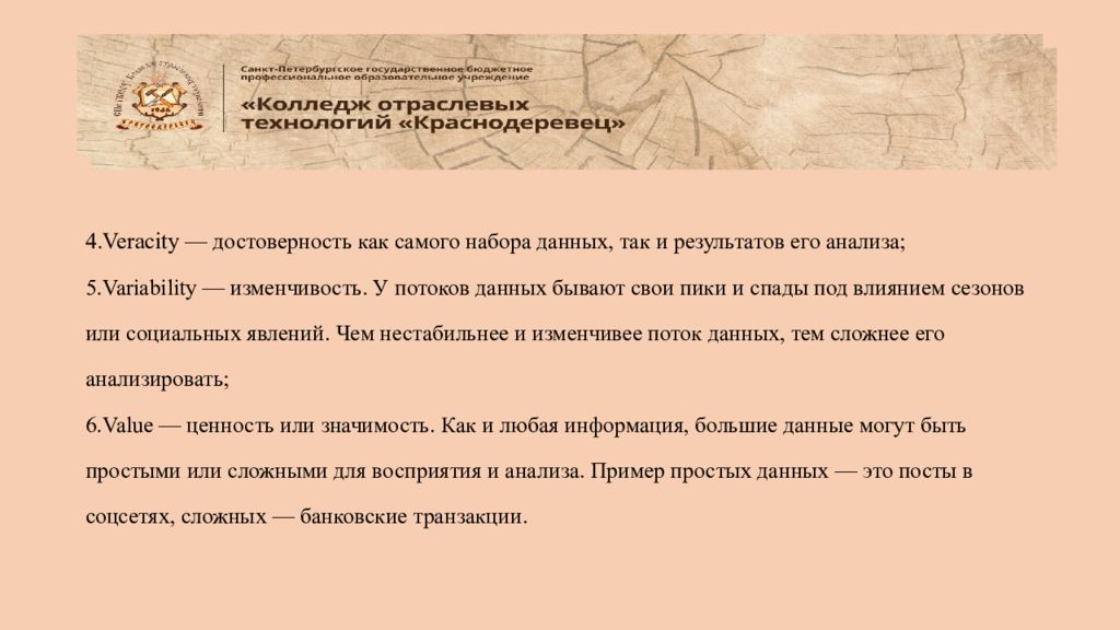 4.Veracity — достоверность как самого набора данных, так и результатов его анализа; 5.Variability — изменчивость. У потоков данных бывают свои пики и спады под влиянием сезонов или социальных явлений. Чем нестабильнее и изменчивее поток данных, тем сложнее его анализировать; 6.Value — ценность или значимость. Как и любая информация, большие данные могут быть простыми или сложными для восприятия и анализа. Пример простых данных — это посты в соцсетях, сложных — банковские транзакции.