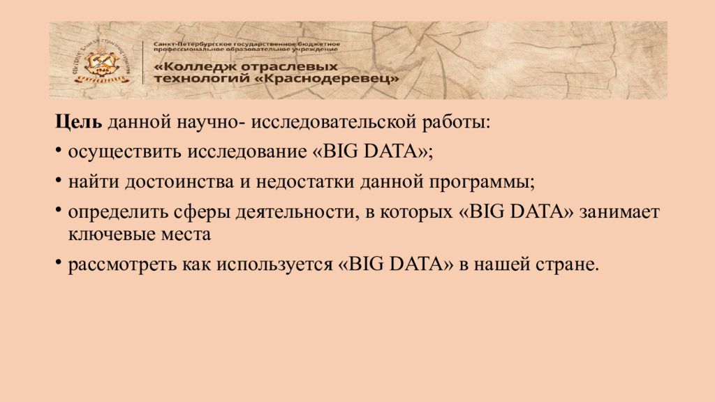 Цель данной научно- исследовательской работы: осуществить исследование «BIG DATA » ; найти достоинства и недостатки данной программы; определить сферы деятельности, в которых «BIG DATA» занимает ключевые места р ассмотреть как используется «BIG DATA » в нашей стране.