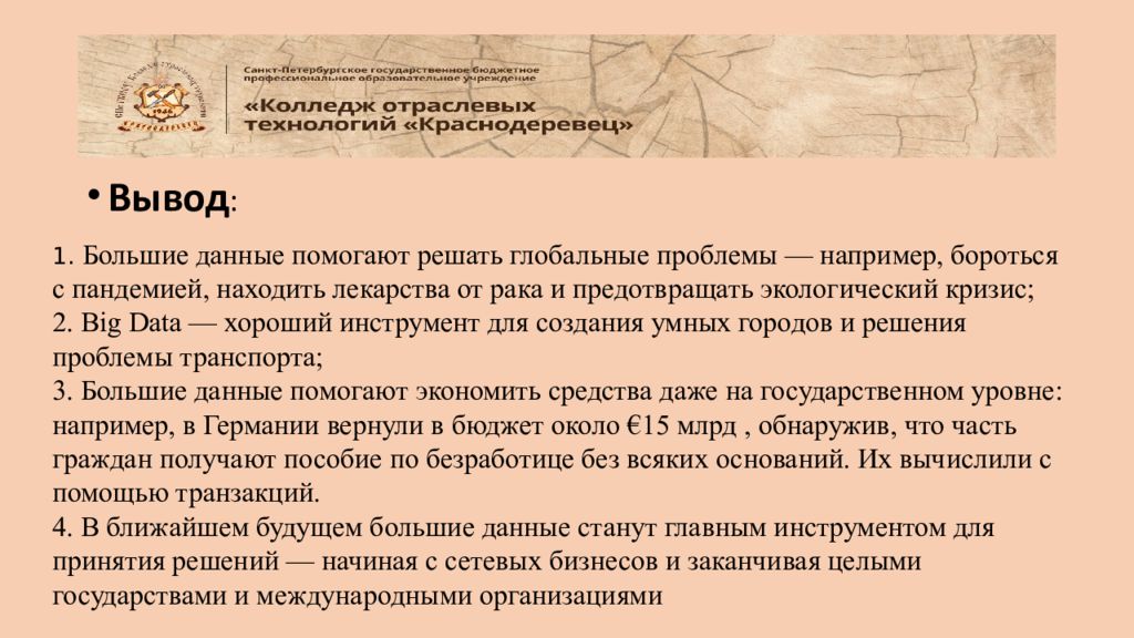 Вывод : 1. Большие данные помогают решать глобальные проблемы — например, бороться с пандемией, находить лекарства от рака и предотвращать экологический кризис; 2. Big Data — хороший инструмент для создания умных городов и решения проблемы транспорта ; 3. Большие данные помогают экономить средства даже на государственном уровне: например, в Германии вернули в бюджет около €15 млрд, обнаружив, что часть граждан получают пособие по безработице без всяких оснований. Их вычислили с помощью транзакций. 4. В ближайшем будущем большие данные станут главным инструментом для принятия решений — начиная с сетевых бизнесов и заканчивая целыми государствами и международными организациями