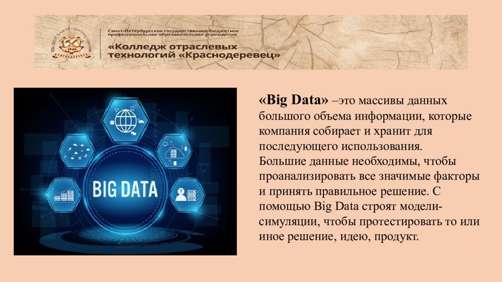 « Big Data » –это массивы данных большого объема информации, которые компания собирает и хранит для последующего использования. Большие данные необходимы, чтобы проанализировать все значимые факторы и принять правильное решение. С помощью Big Data строят модели-симуляции, чтобы протестировать то или иное решение, идею, продукт.