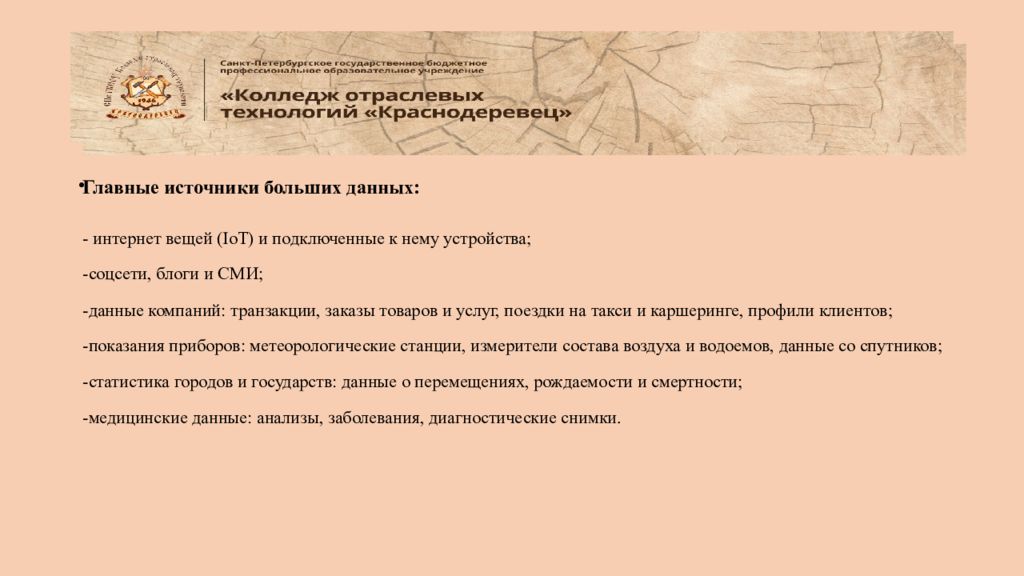 Главные источники больших данных: - интернет вещей ( IoT ) и подключенные к нему устройства; - соцсети, блоги и СМИ; -данные компаний: транзакции, заказы товаров и услуг, поездки на такси и каршеринге, профили клиентов; -показания приборов: метеорологические станции, измерители состава воздуха и водоемов, данные со спутников; -статистика городов и государств: данные о перемещениях, рождаемости и смертности; -медицинские данные: анализы, заболевания, диагностические снимки.