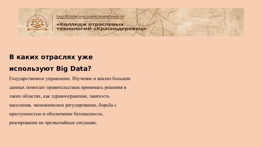 В каких отраслях уже используют Big Data ? Государственное управление. Изучение и анализ больших данных помогает правительствам принимать решения в таких областях, как здравоохранение, занятость населения, экономическое регулирование, борьба с преступностью и обеспечение безопасности, реагирование на чрезвычайные ситуации;