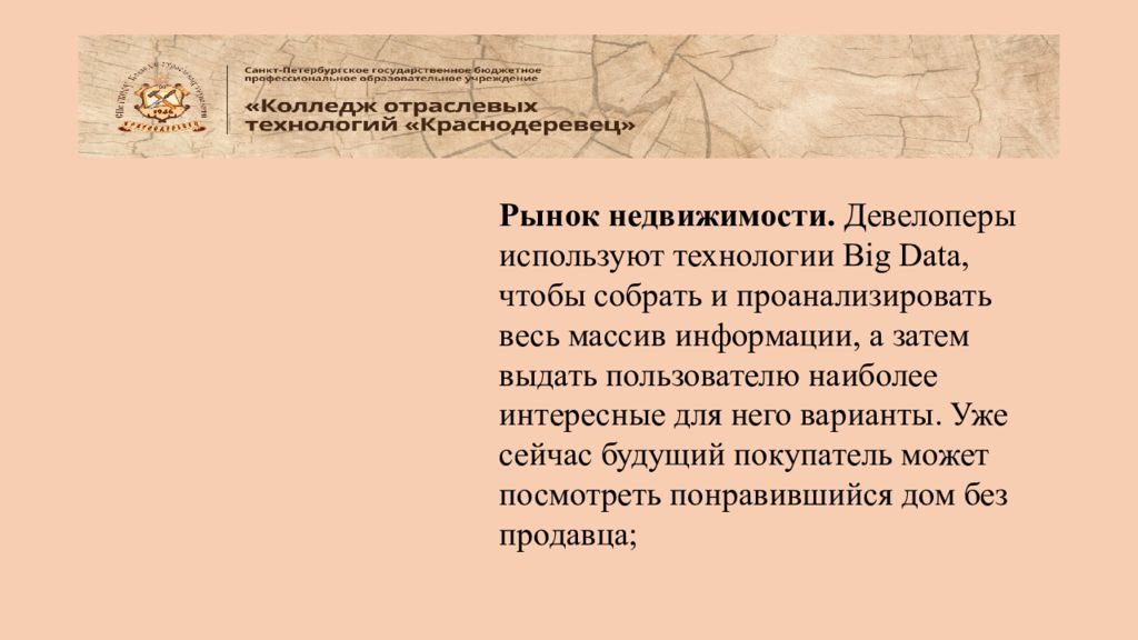 Рынок недвижимости. Девелоперы используют технологии Big Data, чтобы собрать и проанализировать весь массив информации, а затем выдать пользователю наиболее интересные для него варианты. Уже сейчас будущий покупатель может посмотреть понравившийся дом без продавца;