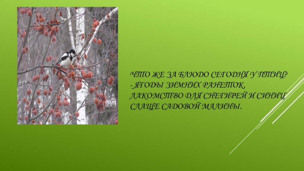 Слайд 4: Что же за блюдо сегодня у птиц? - Ягоды зимних ранеток, Лакомство для снегирей и синиц Слаще садовой малины