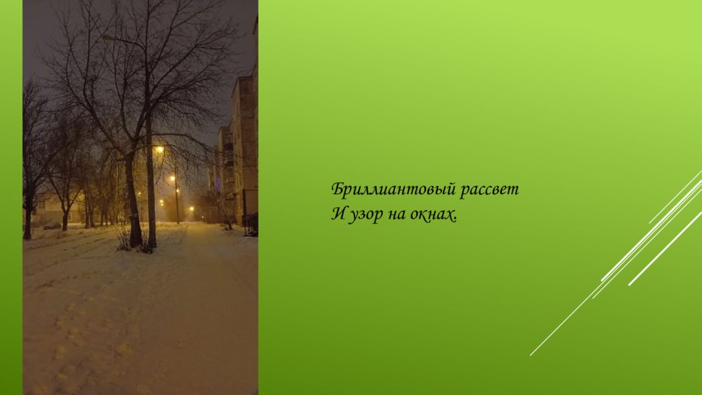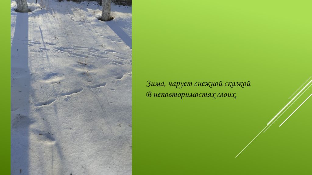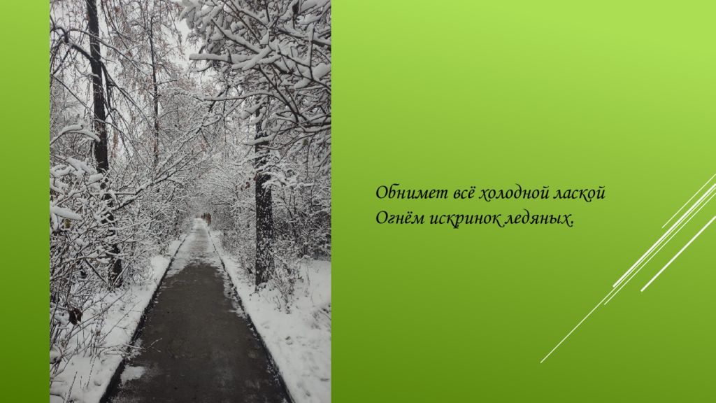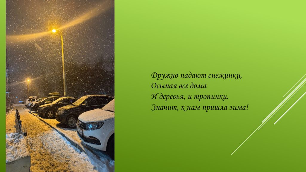 Дружно падают снежинки, Осыпая все дома И деревья, и тропинки. Значит, к нам пришла зима!