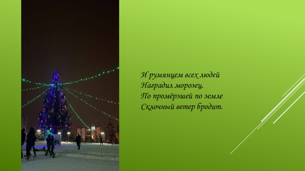 И румянцем всех людей Наградил морозец. По промёрзшей по земле Склочный ветер бродит.