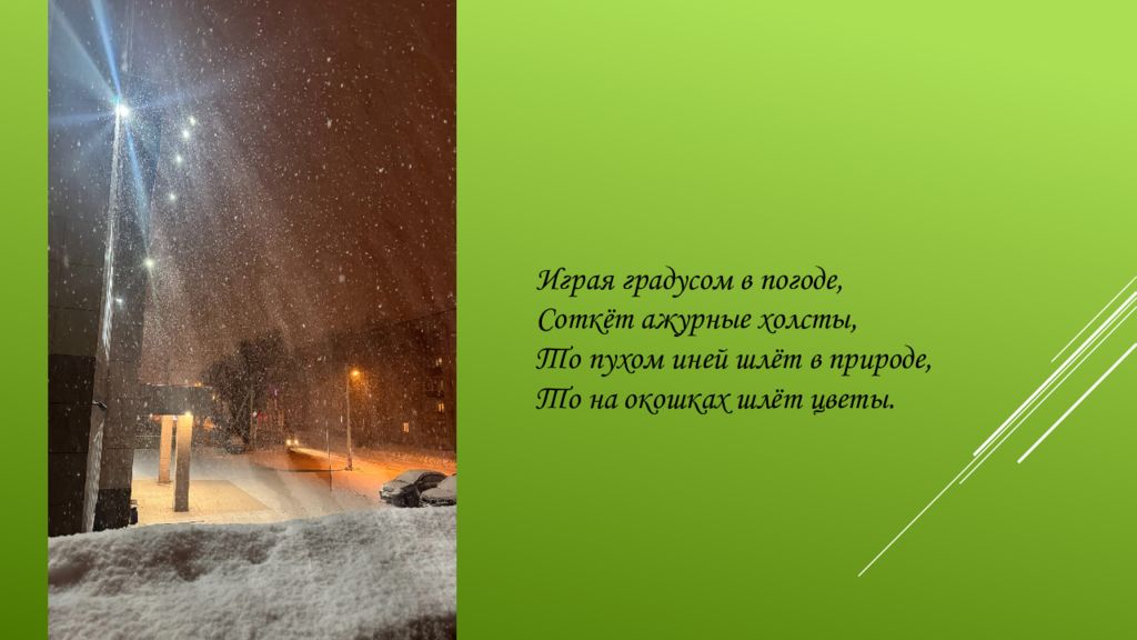 Играя градусом в погоде, Соткёт ажурные холсты, То пухом иней шлёт в природе, То на окошках шлёт цветы.