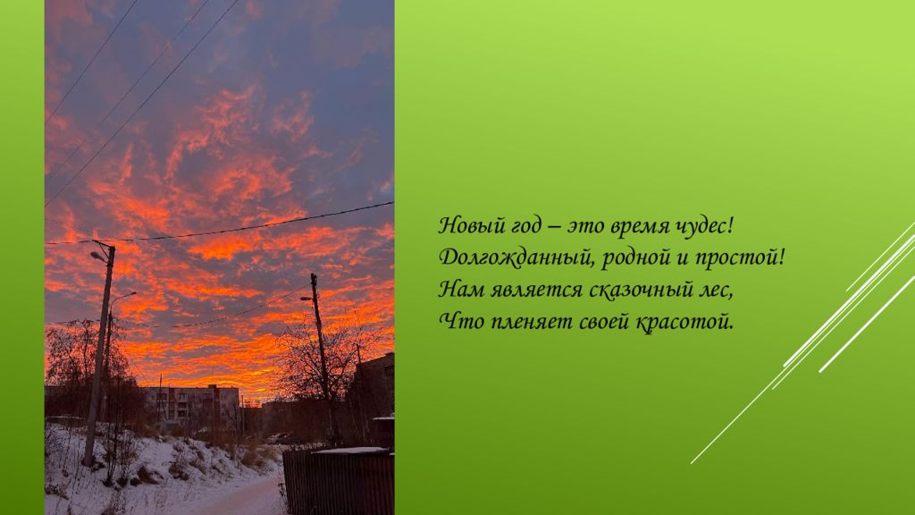 Новый год – это время чудес! Долгожданный, родной и простой! Нам является сказочный лес, Что пленяет своей красотой.