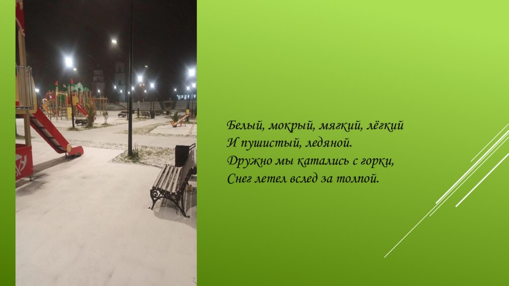 Белый, мокрый, мягкий, лёгкий И пушистый, ледяной. Дружно мы катались с горки, Снег летел вслед за толпой.