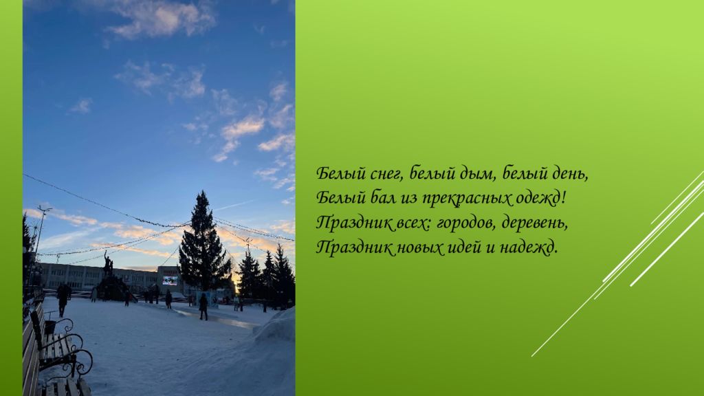 Белый снег, белый дым, белый день, Белый бал из прекрасных одежд! Праздник всех: городов, деревень, Праздник новых идей и надежд.