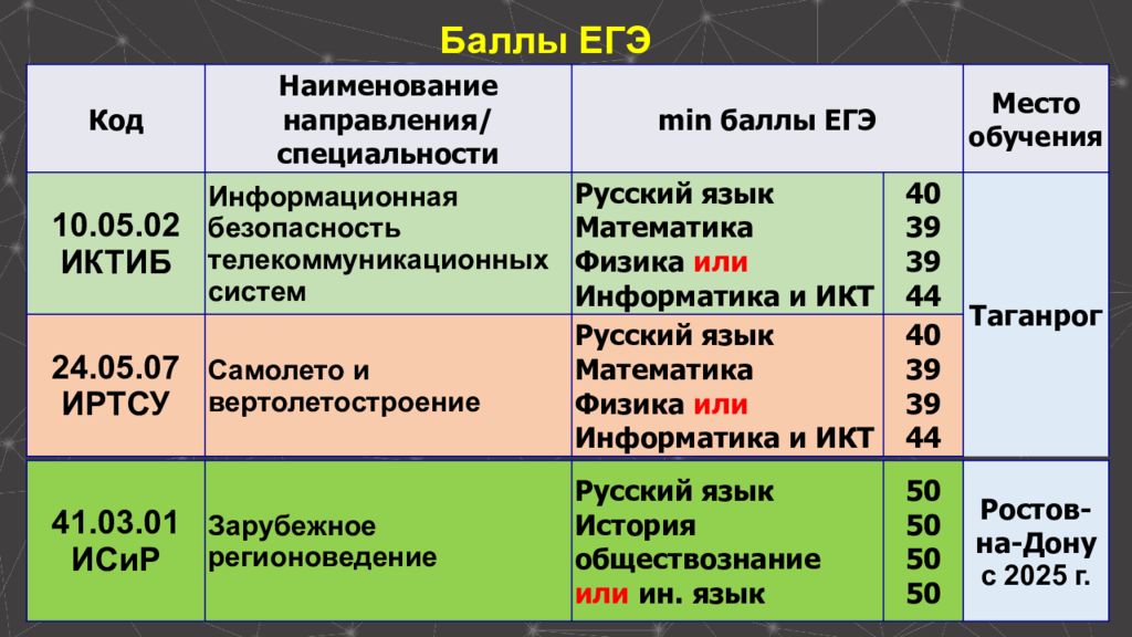 Код Наименование направления/ специальности min баллы ЕГЭ Место обучения 10.05.02 ИКТИБ Информационная безопасность телекоммуникационных систем Русский язык Математика Физика или Информатика и ИКТ 40 39 39 44 Таганрог 24.05.07 ИРТСУ Самолето и вертолетостроение Русский язык Математика Физика или Информатика и ИКТ 4 0 39 39 44 41.03.01 ИСиР Зарубежное регионоведение Русский язык История обществознание или ин. язык 50 50 50 50 Ростов - на-Дону с 2025 г.