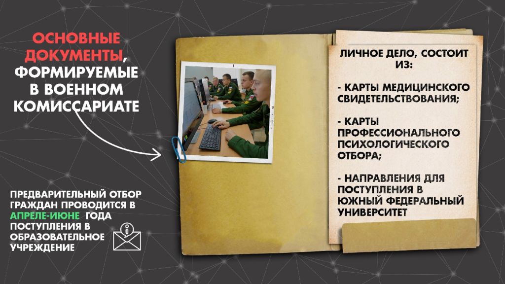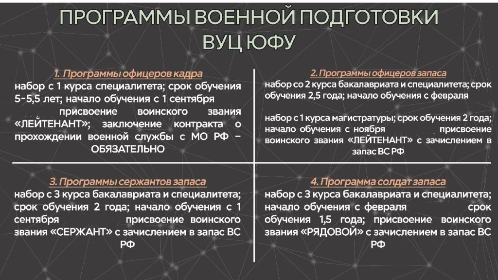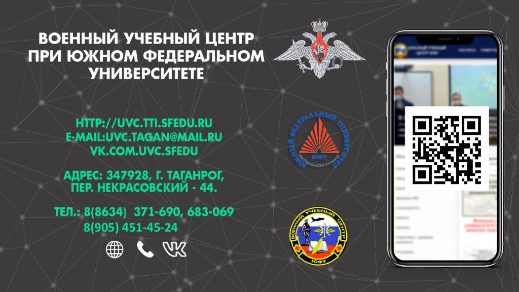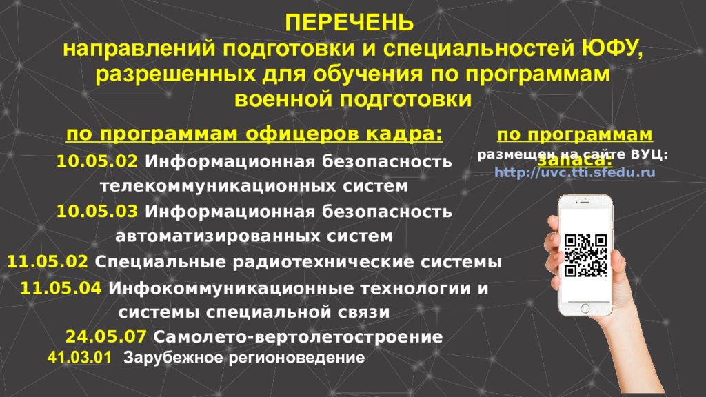 по программам офицеров кадра: 10.05.02 Информационная безопасность телекоммуникационных систем 10.05.03 Информационная безопасность автоматизированных систем 11.05.02 Специальные радиотехнические системы 11.05.04 Инфокоммуникационные технологии и системы специальной связи 24.05.07 Самолето -вертолетостроение 41.03.01 Зарубежное регионоведение по программам запаса: размещен на сайте ВУЦ: http :// uvc. tti. sfedu. ru