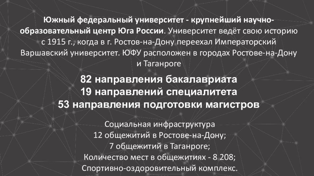 Южный федеральный университет - крупнейший научно-образовательный центр Юга России. Университет ведёт свою историю с 1915 г., когда в г. Ростов-на-Дону переехал Императорский Варшавский университет. ЮФУ расположен в городах Ростове-на-Дону и Таганроге 82 направления бакалавриата 19 направлений специалитета 53 направления подготовки магистров Социальная инфраструктура 12 общежитий в Ростове-на-Дону; 7 общежитий в Таганроге; Количество мест в общежитиях - 8 208; Спортивно-оздоровительный комплекс.