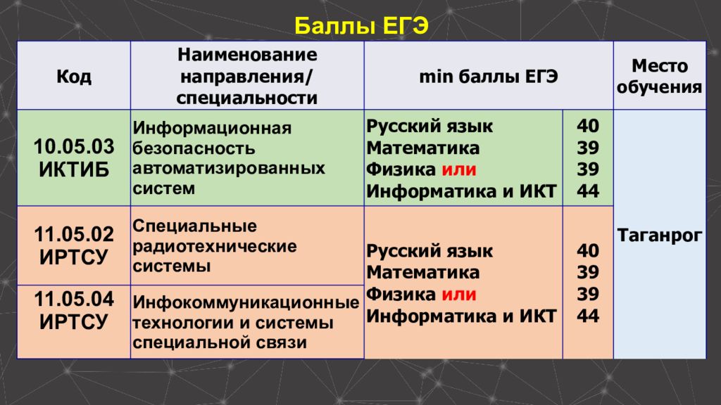 Код Наименование направления/ специальности min баллы ЕГЭ Место обучения 10.05.03 ИКТИБ Информационная безопасность автоматизированных систем Русский язык Математика Физика или Информатика и ИКТ 40 39 39 44 Таганрог 11.05.02 ИРТСУ Специальные радиотехнические системы Русский язык Математика Физика или Информатика и ИКТ 4 0 39 39 44 11.05.04 ИРТСУ Инфокоммуникационные технологии и системы специальной связи Русский язык Математика Физика/Информатика и ИКТ 4 0 39 44