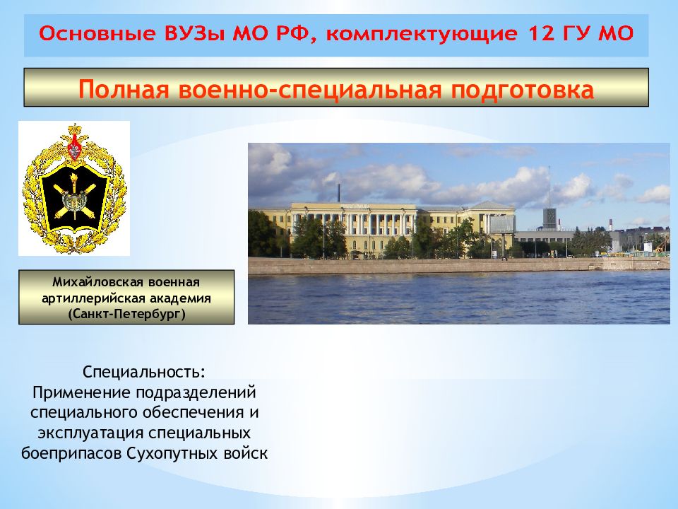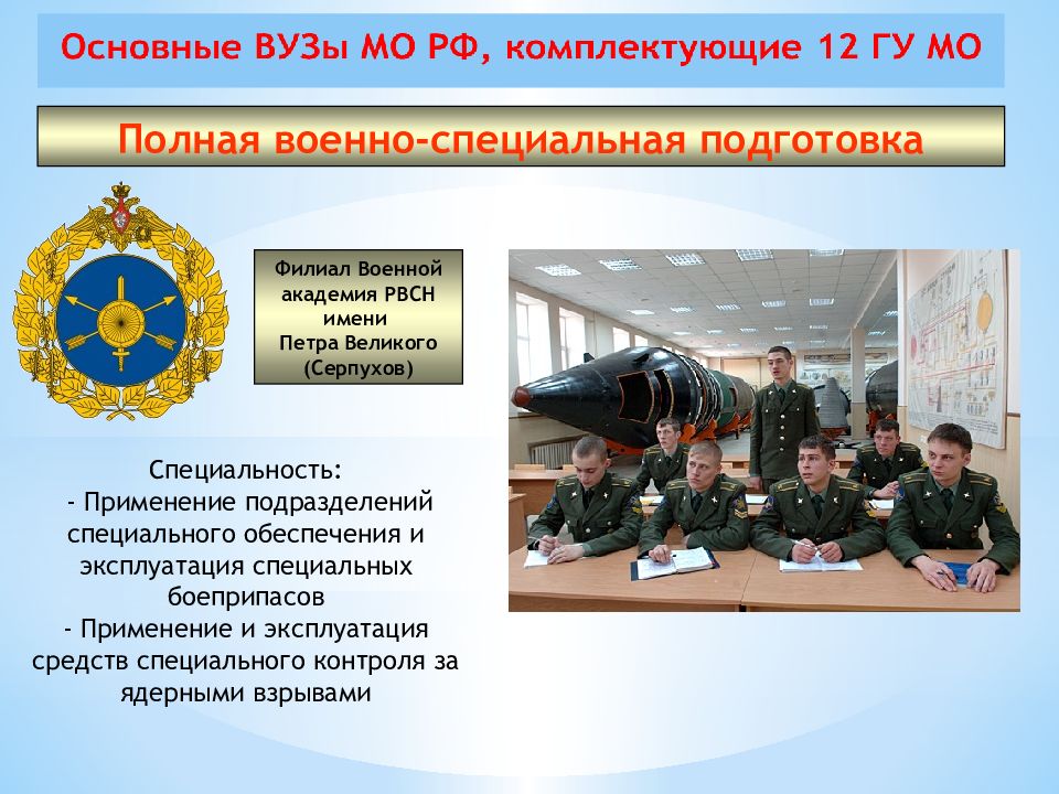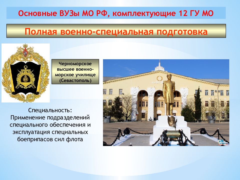 Специальность: Применение подразделений специального обеспечения и эксплуатация специальных боеприпасов сил флота Черноморское высшее военно-морское училище (Севастополь) Полная военно-специальная подготовка Основные ВУЗы МО РФ, комплектующие 12 ГУ МО