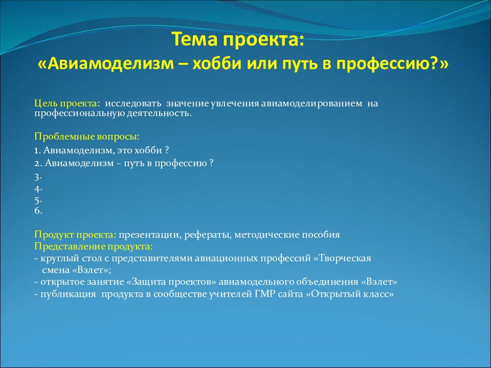 Цель проекта : исследовать значение увлечения авиамоделированием на профессиональную деятельность. Проблемные вопросы: 1. Авиамоделизм, это хобби ? 2. Авиамоделизм – путь в профессию ? 3. 4. 5. 6. Продукт проекта: презентации, рефераты, методические пособия Представление продукта: - круглый стол с представителями авиационных профессий «Творческая смена «Взлет»; - открытое занятие «Защита проектов» авиамодельного объединения «Взлет» - публикация продукта в сообществе учителей ГМР сайта «Открытый класс»
