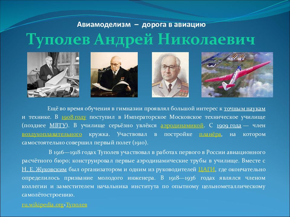 Ещё во время обучения в гимназии проявлял большой интерес к точным наукам и технике. В 1908 году поступил в Императорское Московское техническое училище (позднее МВТУ ). В училище серьёзно увлёкся аэродинамикой. С 1909 года — член воздухоплавательного кружка. Участвовал в постройке планёра, на котором самостоятельно совершил первый полет (1910). В 1916—1918 годах Туполев участвовал в работах первого в России авиационного расчётного бюро; конструировал первые аэродинамические трубы в училище. Вместе с Н. Е. Жуковским был организатором и одним из руководителей ЦАГИ, где окончательно определилось призвание молодого инженера. В 1918—1936 годах являлся членом коллегии и заместителем начальника института по опытному цельнометаллическому самолётостроению. ru.wikipedia.org › Туполев