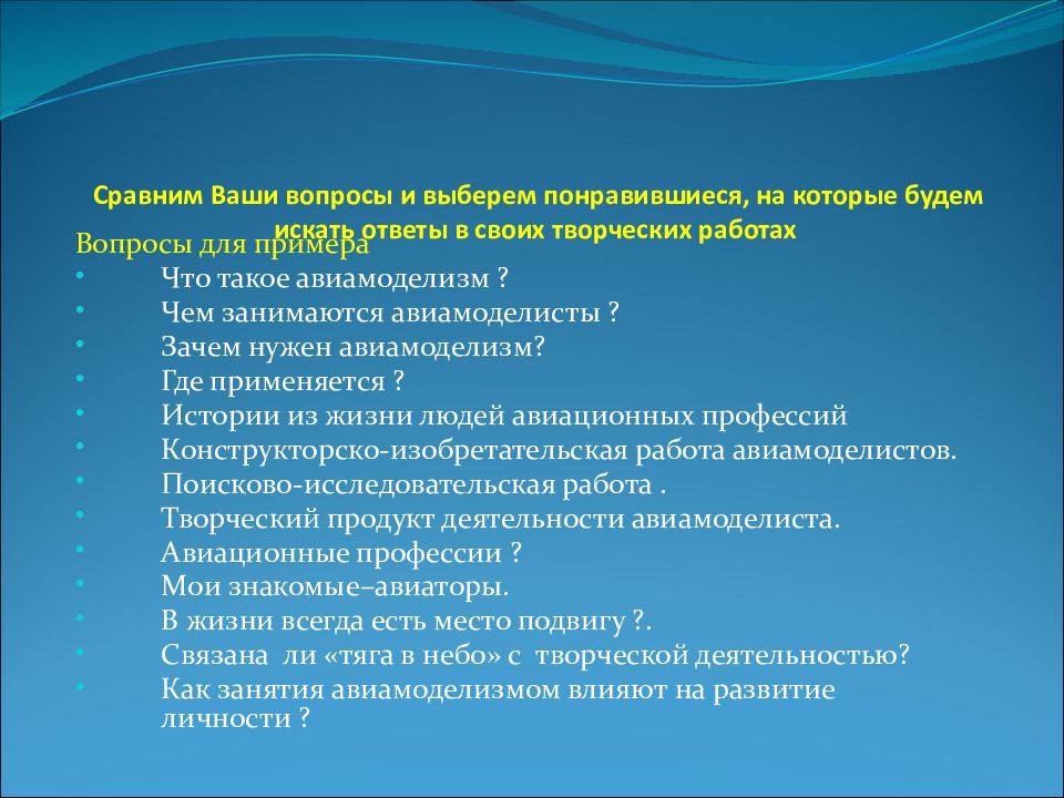 Вопросы для примера Что такое авиамоделизм ? Чем занимаются авиамоделисты ? Зачем нужен авиамоделизм? Где применяется ? Истории из жизни людей авиационных профессий Конструкторско-изобретательская работа авиамоделистов. Поисково-исследовательская работа. Творческий продукт деятельности авиамоделиста. Авиационные профессии ? Мои знакомые–авиаторы. В жизни всегда есть место подвигу ?. Связана ли «тяга в небо» с творческой деятельностью? Как занятия авиамоделизмом влияют на развитие личности ?