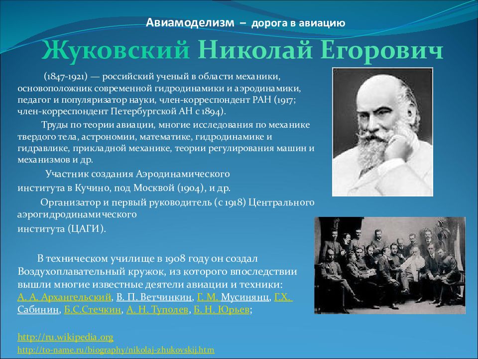 (1847-1921) — российский ученый в области механики, основоположник современной гидродинамики и аэродинамики, педагог и популяризатор науки, член-корреспондент РАН (1917; член-корреспондент Петербургской АН с 1894). Труды по теории авиации, многие исследования по механике твердого тела, астрономии, математике, гидродинамике и гидравлике, прикладной механике, теории регулирования машин и механизмов и др. Участник создания Аэродинамического института в Кучино, под Москвой (1904), и др. Организатор и первый руководитель (с 1918) Центрального аэрогидродинамического института (ЦАГИ). В техническом училище в 1908 году он создал Воздухоплавательный кружок, из которого впоследствии вышли многие известные деятели авиации и техники: А. А. Архангельский, В. П. Ветчинкин, Г. М. Мусинянц, Г.Х. Сабинин, Б.С.Стечкин, А. Н. Туполев, Б. Н. Юрьев ; http://ru.wikipedia.org http://to-name.ru/biography/nikolaj-zhukovskij.htm