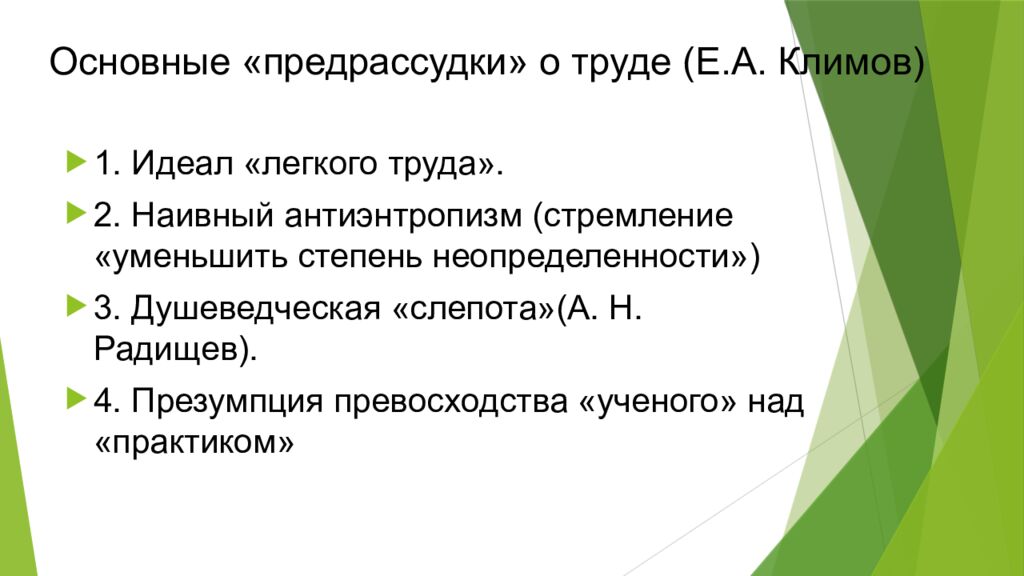 Слайд 12: Основные «предрассудки» о труде (Е.А. Климов)