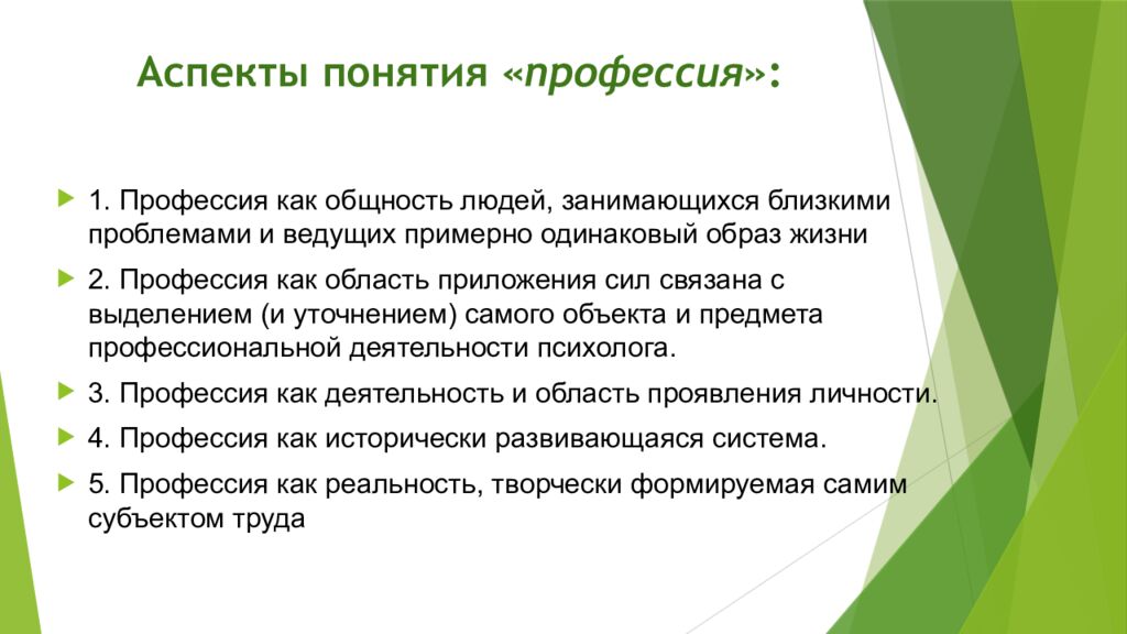 1. Профессия как общность людей, занимающихся близкими проблемами и ведущих примерно одинаковый образ жизни 2. Профессия как область приложения сил связана с выделением (и уточнением) самого объекта и предмета профессиональной деятельности психолога. 3. Профессия как деятельность и область проявления личности. 4. Профессия как исторически развивающаяся система. 5. Профессия как реальность, творчески формируемая самим субъектом труда