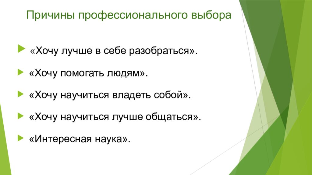 « Хочу лучше в себе разобраться». «Хочу помогать людям». «Хочу научиться владеть собой». «Хочу научиться лучше общаться». «Интересная наука».