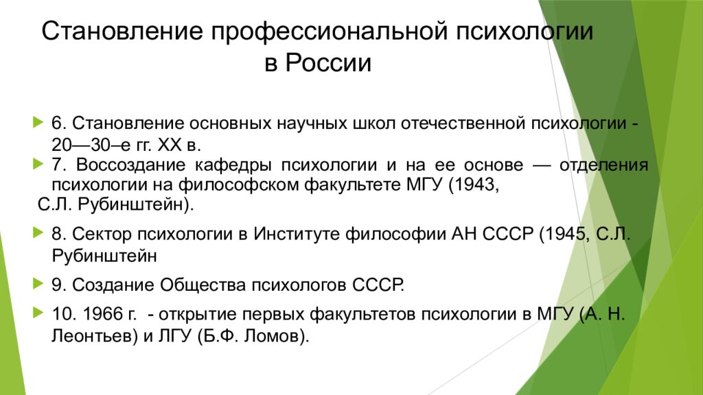 6. Становление основных научных школ отечественной психологии - 20—30–е гг. XX в. 7. Воссоздание кафедры психологии и на ее основе — отделения психологии на философском факультете МГУ (1943, С.Л. Рубинштейн). 8. Сектор психологии в Институте философии АН СССР (1945, С.Л. Рубинштейн 9. Создание Общества психологов СССР. 10. 1966 г. - открытие первых факультетов психологии в МГУ (А. Н. Леонтьев) и ЛГУ (Б.Ф. Ломов).