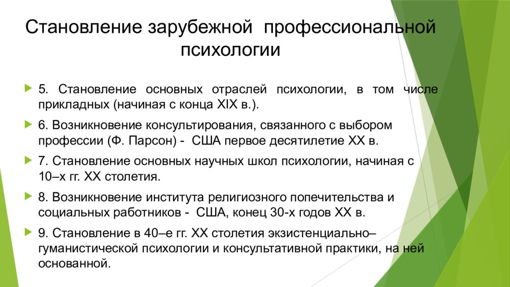 5. Становление основных отраслей психологии, в том числе прикладных (начиная с конца XIX в.). 6. Возникновение консультирования, связанного с выбором профессии (Ф. Парсон ) - США первое десятилетие XX в. 7. Становление основных научных школ психологии, начиная с 10–х гг. XX столетия. 8. Возникновение института религиозного попечительства и социальных работников - США, конец 30-х годов ХХ в. 9. Становление в 40–е гг. XX столетия экзистенциально–гуманистической психологии и консультативной практики, на ней основанной.