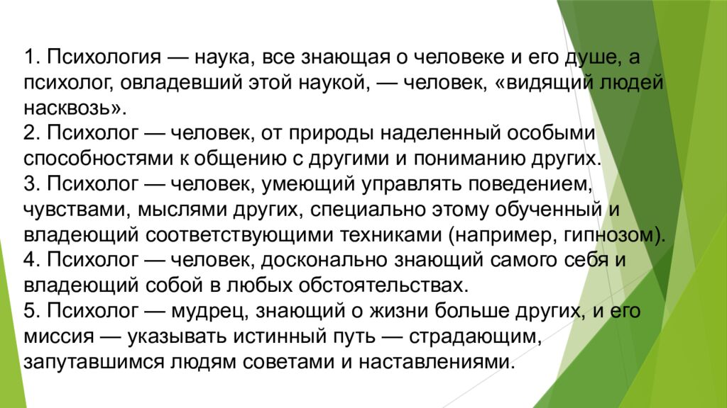 1. Психология — наука, все знающая о человеке и его душе, а психолог, овладевший этой наукой, — человек, «видящий людей насквозь». 2. Психолог — человек, от природы наделенный особыми способностями к общению с другими и пониманию других. 3. Психолог — человек, умеющий управлять поведением, чувствами, мыслями других, специально этому обученный и владеющий соответствующими техниками (например, гипнозом). 4. Психолог — человек, досконально знающий самого себя и владеющий собой в любых обстоятельствах. 5. Психолог — мудрец, знающий о жизни больше других, и его миссия — указывать истинный путь — страдающим, запутавшимся людям советами и наставлениями.