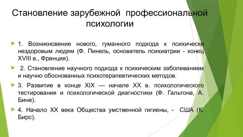 1. Возникновение нового, гуманного подхода к психически нездоровым людям (Ф. Пинель, основатель психиатрии - конец XVIII в., Франция). 2. Становление научного подхода к психическим заболеванием и научно обоснованных психотерапевтических методов. 3. Развитие в конце XIX — начале XX в. психологического тестирования и психологической диагностики (Ф. Гальтона, А. Бине ). 4. Начало XX века Общества умственной гигиены, - США (К. Бирс ).