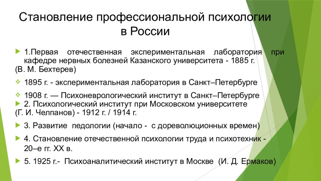 1.Первая отечественная экспериментальная лаборатория при кафедре нервных болезней Казанского университета - 1885 г. ( В. М. Бехтерев) 1895 г. - экспериментальная лаборатория в Санкт–Петербурге 1908 г. — Психоневрологический институт в Санкт–Петербурге 2. Психологический институт при Московском университете (Г. И. Челпанов) - 1912 г. / 1914 г. 3. Развитие педологии (начало - с дореволюционных времен) 4. Становление отечественной психологии труда и психотехник - 20–е гг. XX в. 5. 1925 г.- Психоаналитический институт в Москве (И. Д. Ермаков )