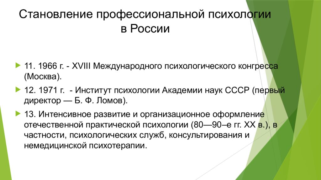 11. 1966 г. - XVIII Международного психологического конгресса (Москва ). 12. 1971 г. - Институт психологии Академии наук СССР (первый директор — Б. Ф. Ломов). 13. Интенсивное развитие и организационное оформление отечественной практической психологии (80—90–е гг. XX в.), в частности, психологических служб, консультирования и немедицинской психотерапии.