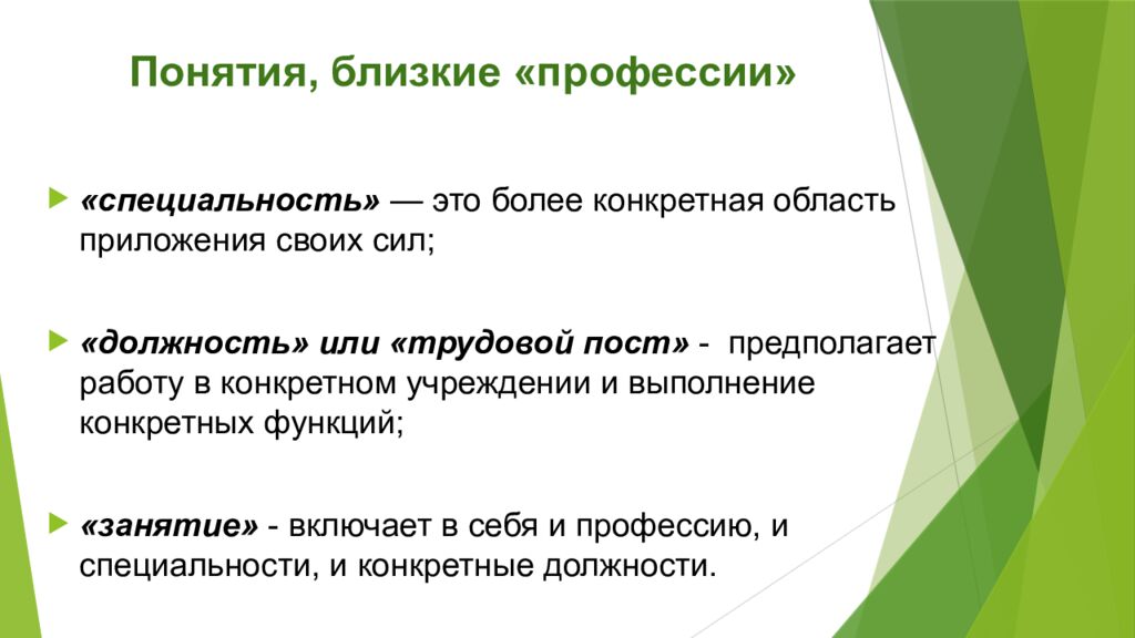 «специальность » — это более конкретная область приложения своих сил; «должность» или «трудовой пост » - предполагает работу в конкретном учреждении и выполнение конкретных функций; « занятие» - включает в себя и профессию, и специальности, и конкретные должности.