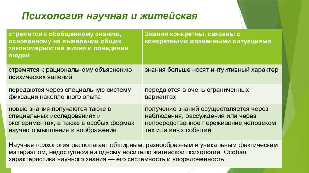 стремится к обобщенному знанию, основанному на выявлении общих закономерностей жизни и поведения людей Знания конкретны, связаны с конкретными жизненными ситуациями стремятся к рациональному объяснению психических явлений знания больше носят интуитивный характер передаются через специальную систему фиксации накопленного опыта передаются в очень ограниченных вариантах новые знания получаются также в специальных исследованиях и экспериментах, а также в особых формах научного мышления и воображения получение знаний осуществляется через наблюдения, рассуждения или через непосредственное переживание человеком тех или иных событий Научная психология располагает обширным, разнообразным и уникальным фактическим материалом, недоступном ни одному носителю житейской психологии. Особая характеристика научного знания — его системность и упорядоченность